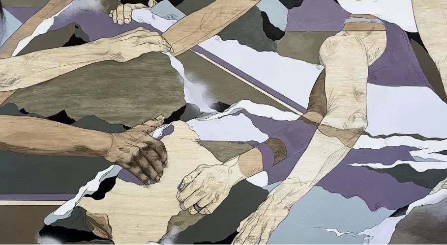 Fragility isn’t in Lindsey Wolkowicz’s vocabulary. In “folds and faults” at Jane St. Art Center, the Kingston-based artist’s figures tumble, collide, and grasp at anchors in a world of shifting surfaces and psychic landslides. Her layered compositions—part drawing, part architecture—treat bodies not as symbols of grace but as battlegrounds of memory, grief, and stubborn persistence. Working on wood and paper, Wolkowicz leaves parts of the surface raw, a reminder that skin, like space, bears scars. The result is an urgent, unpretty poetry of survival, where connection is tenuous but vital and control is always an illusion at best.