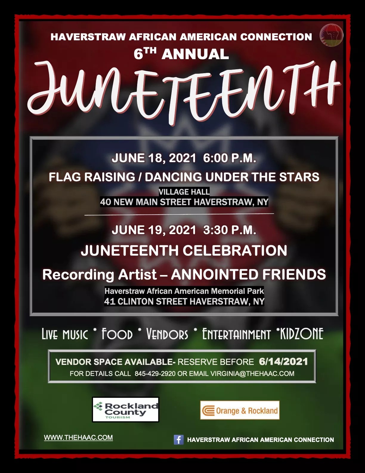 Celebrate Juneteenth in Haverstraw with dancing and a flag-raising ceremony on Friday, June 18, and a festival on Saturday, June 19 in Haverstrawโs African-American Memorial Park. The festival kicks off at 3:30pm with live entertainment, food, and vendors celebrating the history of the Black community. The park has a kiosk with displays about local Black history and the African diaspora.
