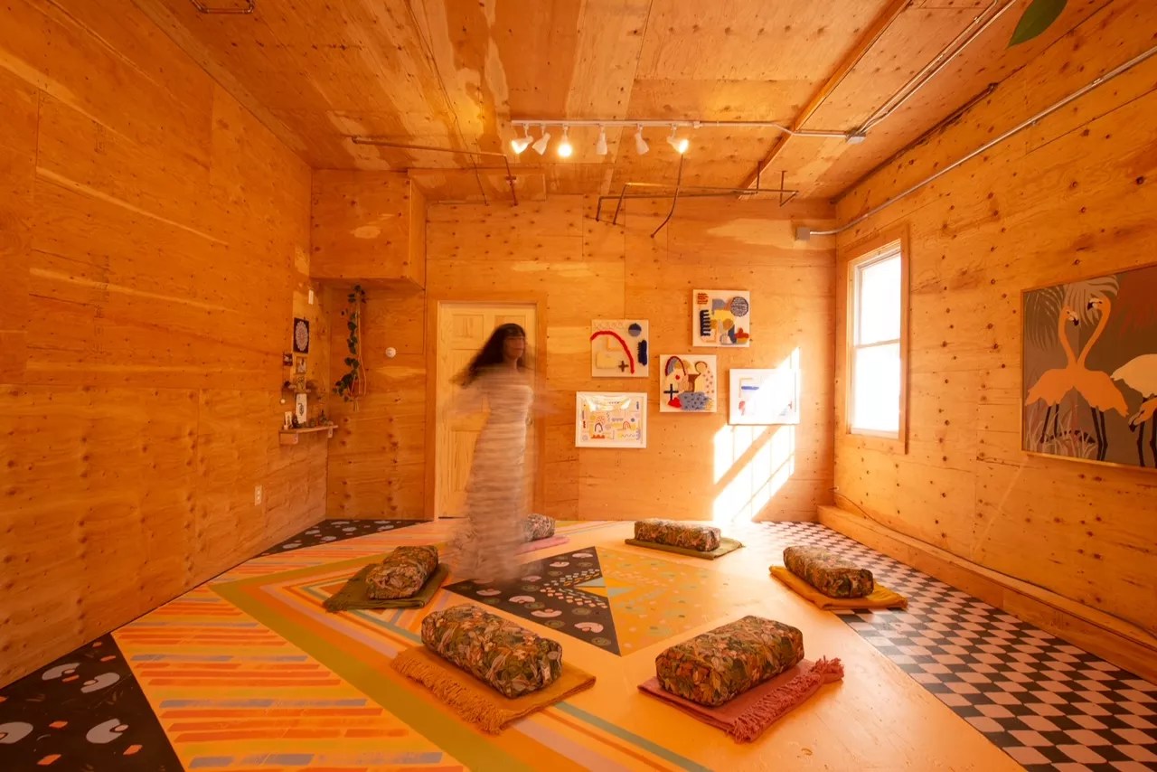 YIN is a lifestyle shop and sound meditation studio by Rebecca Conran—a self-funded artist, musician, and multi-modality healing practitioner. Conran designed and installed the space herself during quarantine in March 2020 using found and recycled materials, and painted the happy Memphis-esque Reiki-infused murals on the floor.