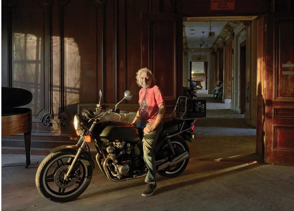 In fact, Rock Ledge is a mansion that became a rehab center for Daytop Village, and is presently unused. Erik is the caretaker, and stores his motorcycles there. He’s also responsible for the sign “Challenge Your Fears” above the doorway. On a wall at the rear of the hallway are some Daytop Village slogans. (Moore’s photographs are intended to be printed in large format, where telling details become easily visible.)