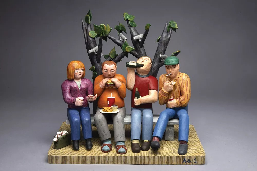 “Most artists give titles to their work long after they’re finished,” Geneslaw observes, “but it’s actually the title itself that suggests the piece to me.” Weapons of Mass Destruction (Pick Your Poison) shows four characters on a bench: a woman with a satchel full of pills, a man drinking two beers at once, a guy with an enormous hamburger—plus French fries, soda, and a cupcake. A fourth figure is smoking three cigarettes. In the body language of the four, Geneslaw captures the depressive comradeship fellow addicts share. Notice that she chooses very common societal vices, rather than heroin or crack. She wants us to recognize ourselves in these self-destructive figurines. The diorama operates like a joke. Instead of: “A Frenchman, an Englishman, and a Jew walk into a bar,” there’s “an alcoholic, a pill addict, a smoker, and an overeater sat on a bench…” The title suggests an irony: the US went to war over the mythical “weapons of mass destruction” in Iraq, while millions of Americans were destroying themselves with legal addictions at home. Geneslaw’s art reminds me of protest songs of the 1960s like “The Times They Are a-Changin'” and “Universal Soldier.” She is carving songs of outrage in wood.