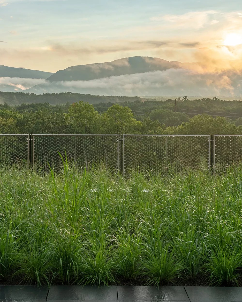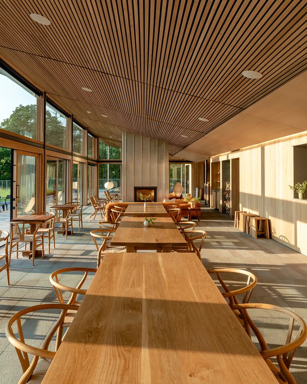 The Piaule restaurant is located in the main building, a low-slung edifice of cast concrete and unfinished oak that’s minimalist but not aggressively so. There’s a spa and pool downstairs. The top floor is a large open room with a reception desk, lobby at one end and dining area semi-open kitchen at the other, bisected by a two-sided fireplace. (This is what I imagine most of Stockholm looks like, or how a Swede would design the waiting room to the afterlife.) The entire western wall is windows with uninterrupted views on the Catskills. Through the glass is a sprawling stone deck.