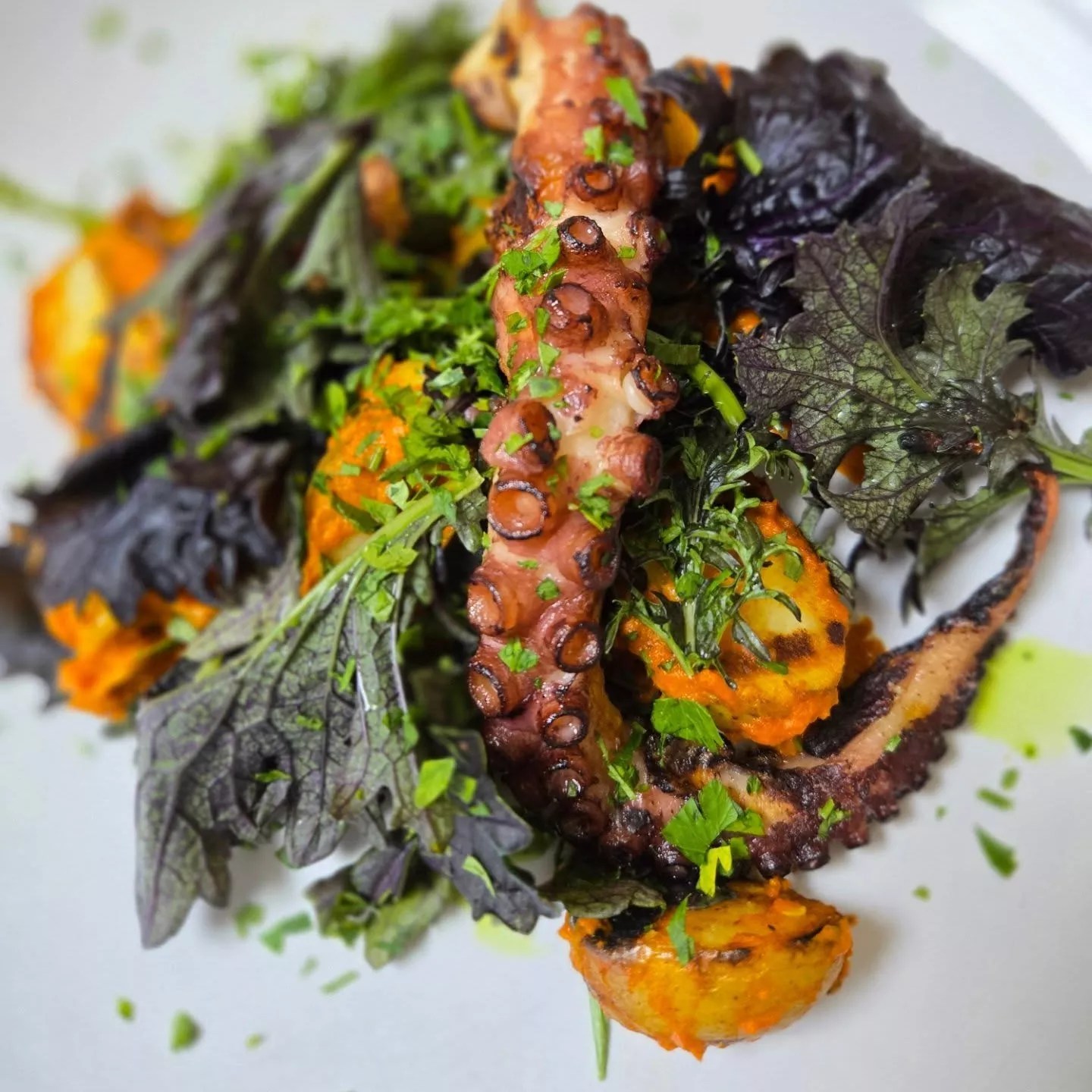 Given its Mediterranean inspiration, Phos would be remiss not to offer some turf menu options. Like any great Greek restaurant, thereโs an appetizer of grilled octopus ($27). Skiadasโs is served on a sweeping spoonful of smoked pepper vinaigrette with potatoes and olivesโthe best-executed version of such a dish Iโd had in recent memory. Other starters include calamari with a lentil crust and black olive aioli ($19), one of a few varied uses of olives on the menu.