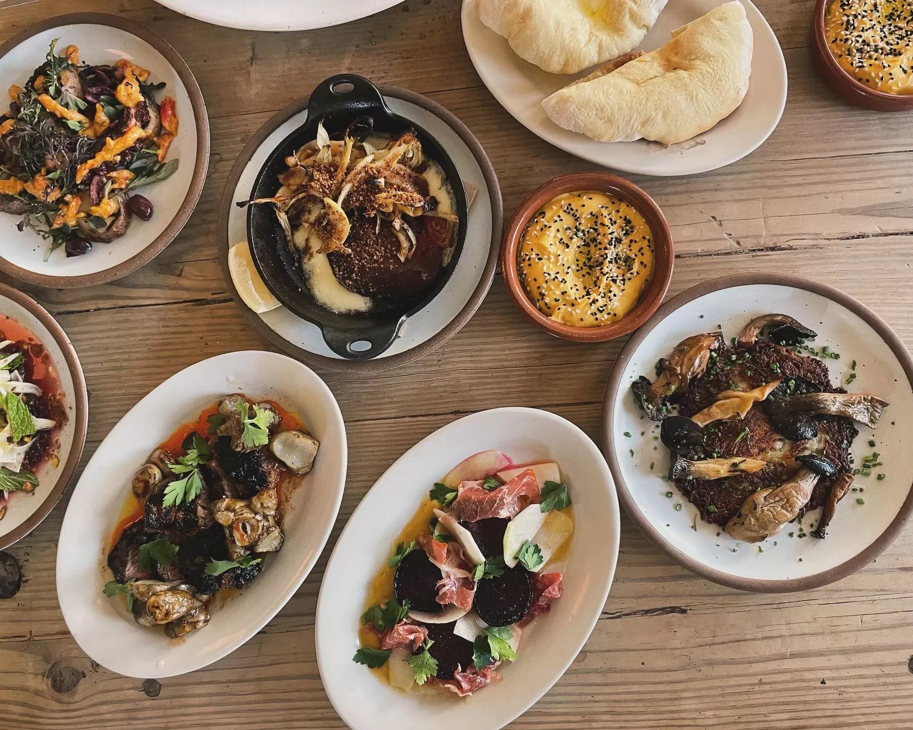 Across the board, dishes are presented in an almost decorative manner. The five mezzes (available one for $6 or all five for $23) are served together in a large bowl, resembling a color wheel. The fava-bean green, red-pepper orange, and tzatziki-white arrive side by side, inviting you to test the flavors individually or blend them using the soft tip of a pita. The flatbread is homemade and served warm from the oven. It has a floury, salty texture almost akin to pizza dough.