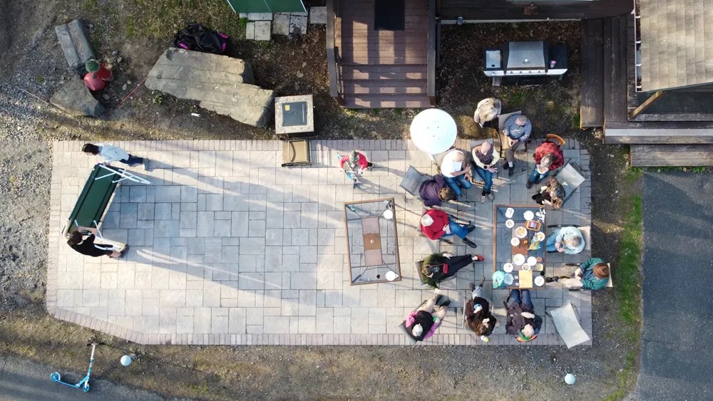 Attending the weekly gathering isn’t mandatory, but it is enticing. On a recent mild spring evening, the variety of the community’s residents, and the deep bonds they’ve formed over years of building their thriving cooperative neighborhood, are on full display. “OG” retirees, some of them residents since the association first broke ground on the site in 1997, gather around a table on the property’s common patio. Children take advantage of the warm spring weather, setting up a ping-pong table or playing on the central green space ringed by 12 of the original single-family homes. Other children dart into the community’s six acres of preserved woodlands. A few parents play with the children, while others take a break to socialize with their neighbors.