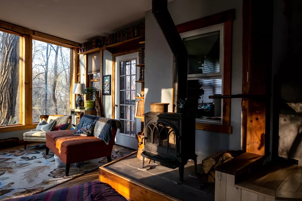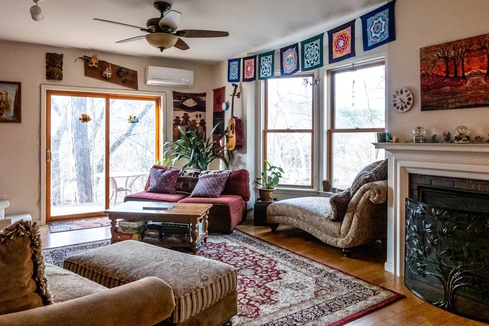 “It actually took seven years,” she says. In that time, other members came and went, but Murphy and Poccia remained. With an eye toward sustainability, the community eventually decided on building 12 modular homes and a common house, all designed to blend in with the surrounding environment. Working with architect Raym de Ris, each structure was carefully planned to balance the needs of the family with the whole ethos of the shared property. Just around 1,000 square feet, Murphy and Poccia’s home includes an open-concept living room, dining room and kitchen on the first floor as well as a guest room. The couple’s large primary bedroom, bathroom, and ample closet space are upstairs. Eventually, the community expanded, buying two adjacent properties, renovating one home and building others for a total of 19.
