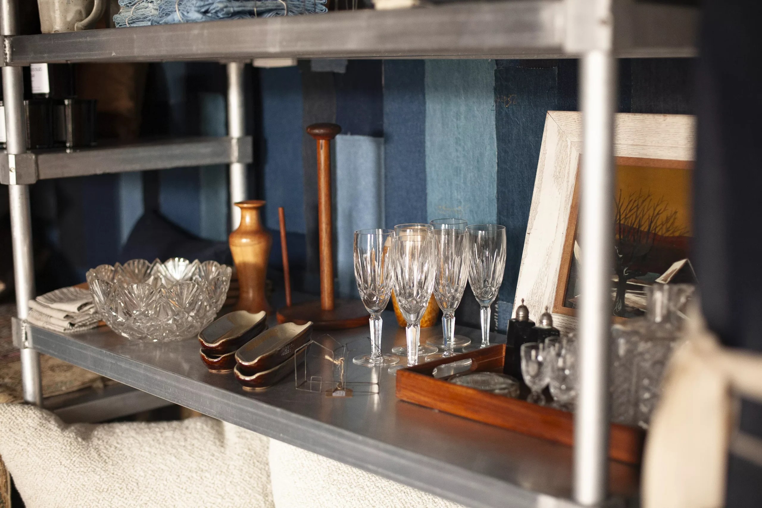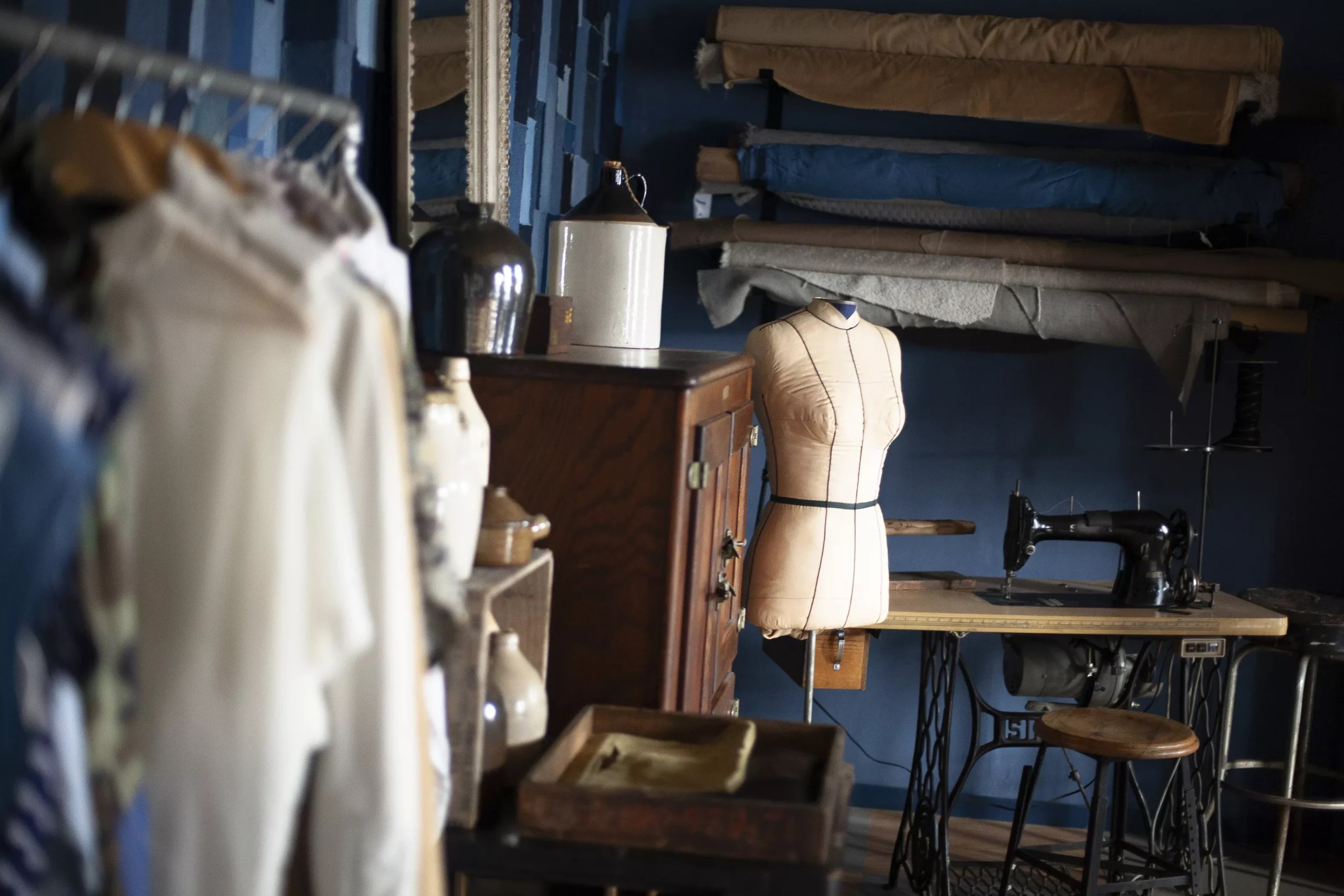 The space, with its high tin ceilings and moody, plastered blue walls, is a cross between workshop and retail shop, office and showroom, and a calling card for Lane’s aesthetic. It is where she and her all-women team of employees create their custom line of soft goods ranging from pillows to placemats, purses to table runners, earrings and eyeglass cases in deadstock fabrics, which she keeps by the bolt leaning against the walls. Shelves show off finished products for sale plus a curated selection of thrifted goods and items from local makers.