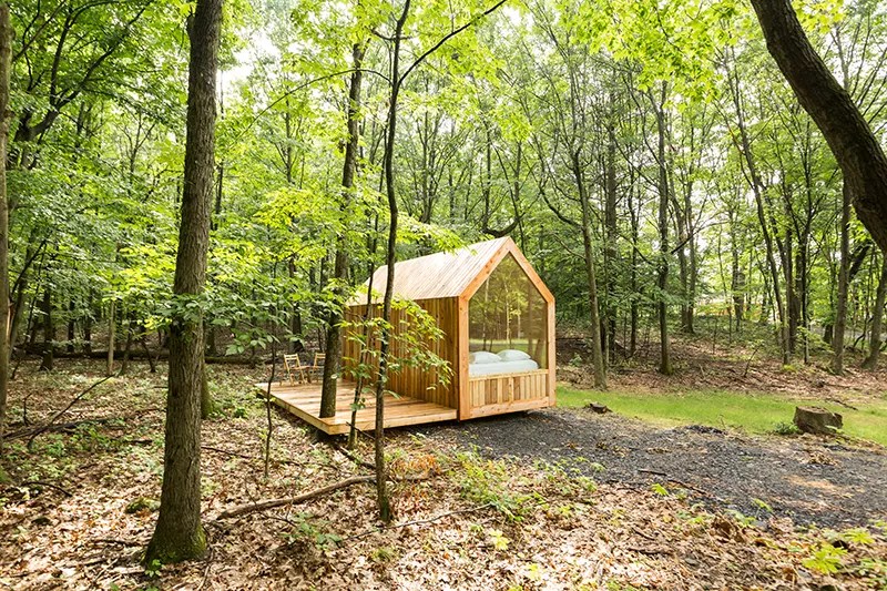 Each 160-square-foot glamping cabin has a king-size bed, full bathroom, closet with a large mirror, and an outside deck with table and chairs. They’re also equipped with a coffee maker, electric tea kettle, and locally-sourced bath products. Guests have the option to pre-order food and drink from local cafes and shops so you never have to leave this sanctuary of relaxation.