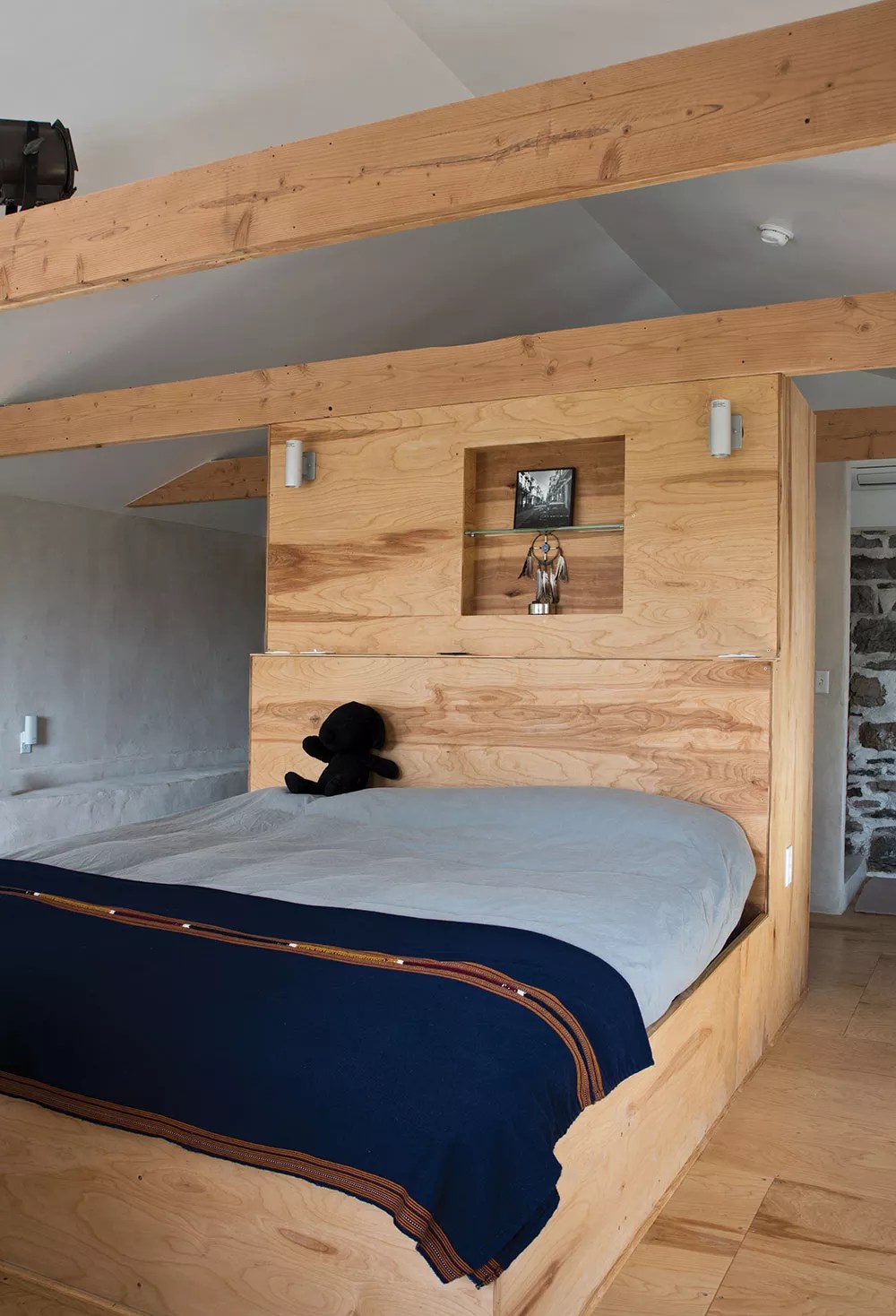 At the back of the refurbished kitchen, behind another tiny door, a narrow, winding staircase leads to a separate master bedroom suite. Once an attic, Zeller believes the space was expanded by previous owners into a bedroom by adding dormers to the north- and south-facing walls. Almost completely destroyed by the fire, the space had to be rebuilt from the floor up. To contrast the home’s colonial feel, Zeller laid simple wood floors and plastered the walls giving the space a modern, almost Southwestern ambiance. A giant, freestanding headboard doubles as closet wall, opening from behind into a bathroom area and another repointed stone wall. Zeller installed a clawfoot tub at the south edge of the room and, tucked away in the corner, an open concrete shower. In the west, Zeller replaced the burnt-out walls with large triangular windows that offer a grand view of the Catskill Mountains.