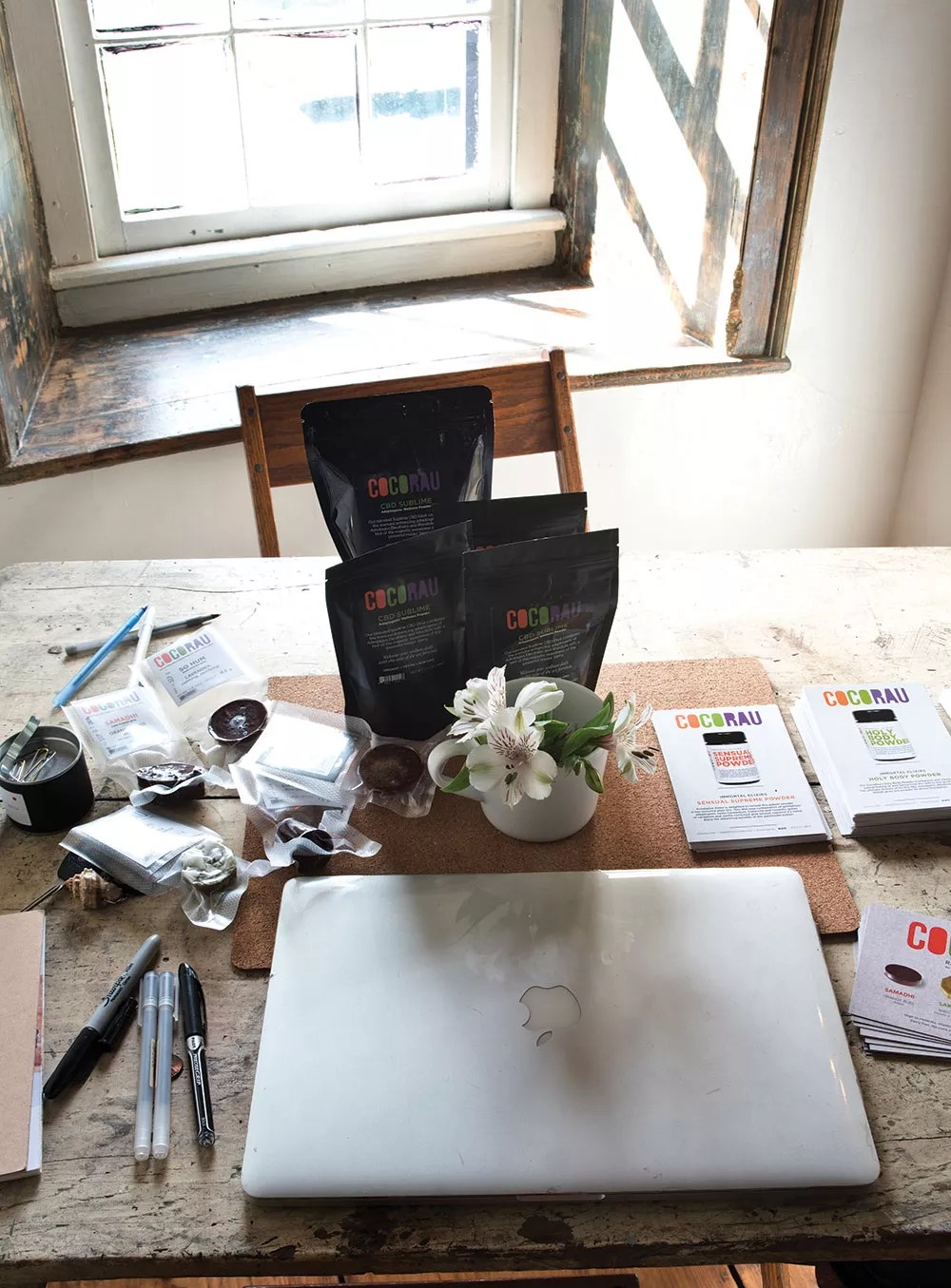 Ten years in, burn out, back pain, and chronic laryngitis lead Zeller to seek out alternative healing modalities. Working with a naturopath, she went on a detox diet for seven months and studied everything she could about the connection between food and wellness. “When I finished the detox and felt healthy again, I was craving chocolate, but I didn’t want to eat sugar or any other additives,” she explains. So she did what any good self-starter would do and learned to make her own. She brought the chocolates with her when she went back to work, sharing them on photo shoots where they were eagerly devoured. Realizing there was a market for her health-supportive treats, Zeller lunged headfirst into her next challenge—launching Cocorau, a line of raw nutrient-based snacks and adaptogenic herb powders.