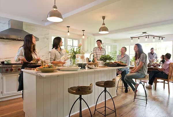 First, they gutted the kitchen. By enclosing a covered porch at one end and bumping out a wall at the other, they expanded the space to include a pantry and dining area. Choi found a reproduction of a traditional farmhouse sink with double drainboards and designed counter space, cabinetry and appliances around it. A wall dividing the kitchen from the former dining room was removed, and the area was made into a den, now filled with Legos and seating. They added a mudroom and half bath next to the pantry. A wooden dining table with seating for 10 looks westward through French doors, offering a view delicious enough to match the meals.