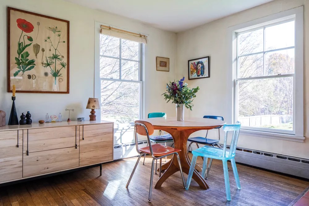 The couple did some initial work on the 1730-square-foot house when they first moved in. Downstairs, they removed a wall between the kitchen and living room to create a pass-through over one of the kitchen counters and borrowed space from an adjacent closet to expand the kitchen area. During their first winter in the house, snow seeped in through the downstairs windows, so they upgraded the glass but left their farmhouse charm intact. They couple added a wood stove to the living room area, enhancing the cozy feeling throughout the first floor.