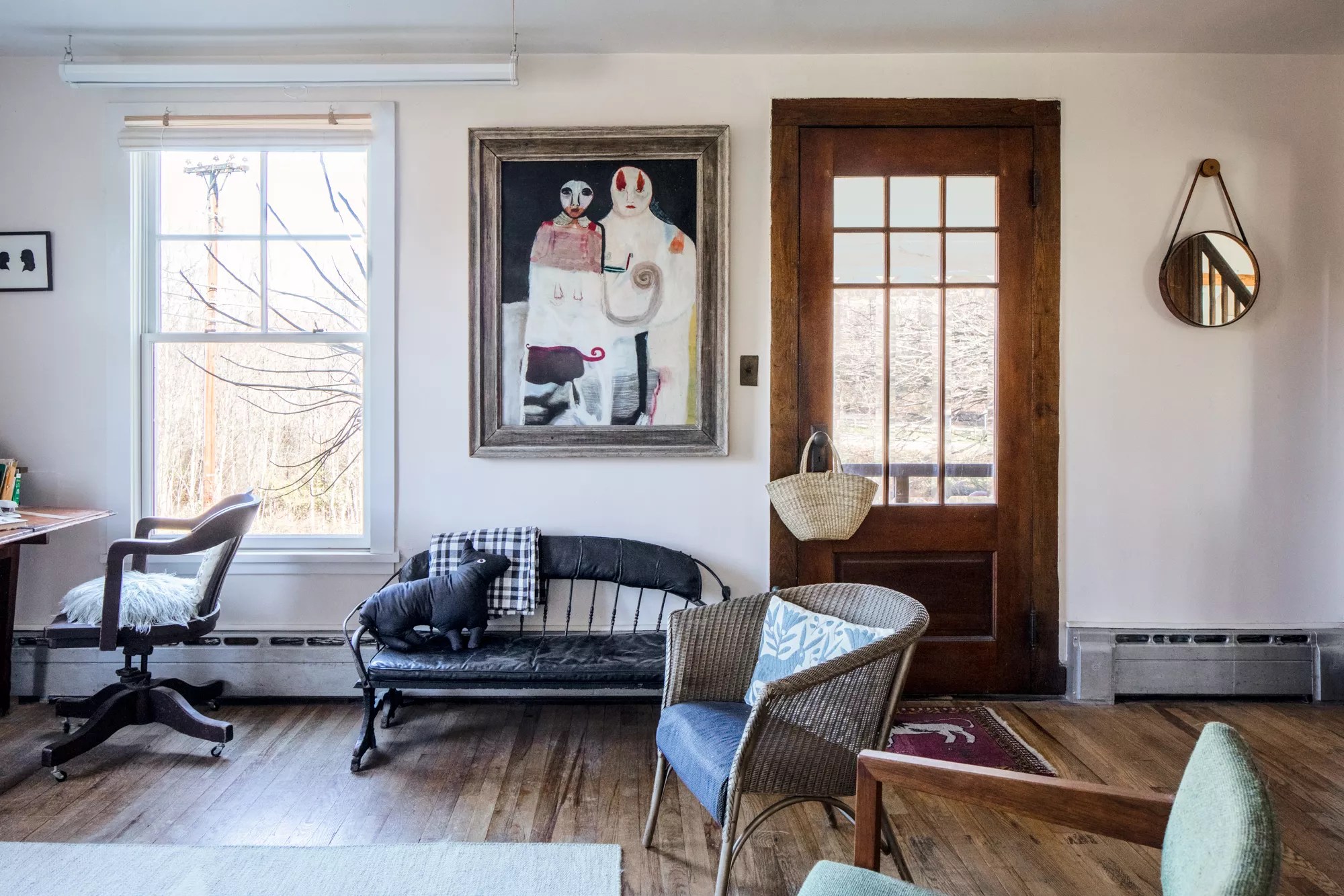 Off the traditional second-floor farmhouse landing, they built an additional bathroom by adding plumbing and fixtures. The two salvaged a farmhouse-style sink locally, then found the perfect claw foot bathtub in Brooklyn. “We dragged the tub across the streets of New York City,” remembers Kinsella. “In hindsight, we might have realized dragging a claw foot tub all the way from Brooklyn to Rosendale was too much work.” Over the years the couple have decorated the home with an eclectic mix of second-hand furniture and work by local artists. They converted the parlor into a sewing room where a collection of Potter’s grandfather’s oil paintings adorns the walls.