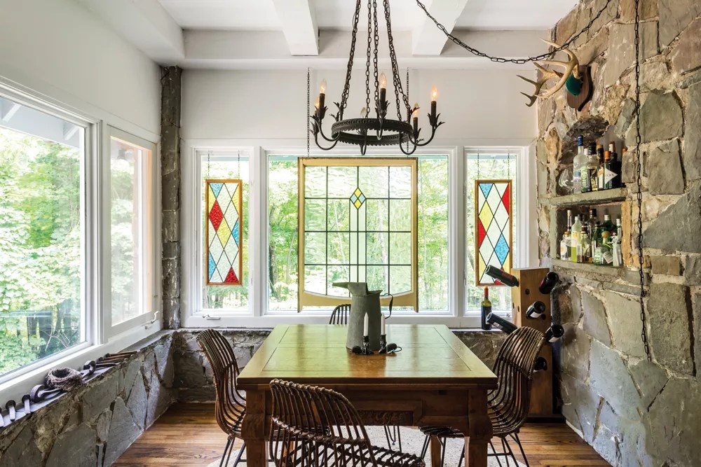 Gironda and Facci suspect their dining area was once an outdoor porch that was eventually enclosed. They left one of the bluestone walls exposed and accentuated the stone walls and trim by adding an iron chandelier. A cut-out in the stone wall serves as an ad hoc bar. Credit: Winona Barton Ballentine