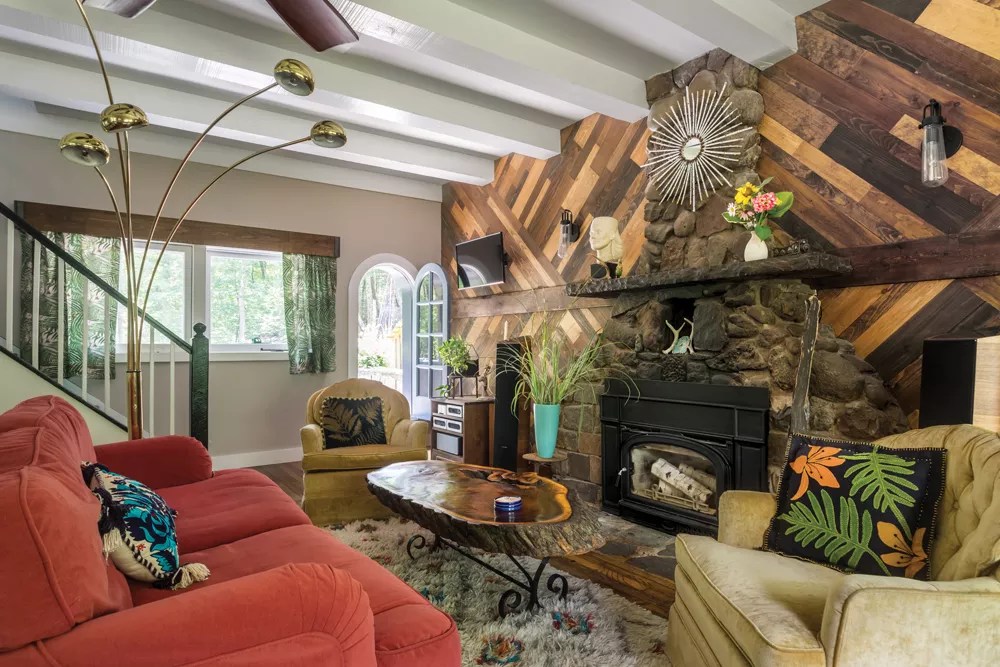 The home’s living room was completely redesigned and rebuilt by Facci and Gironda in 2015. They rebuilt the walls, refinished the floors, painted, and added the fireplace insert.The space is decorated with an eclectic mix of Facci’s craft work. “I’m an avid crafter andmy mind is always looking for things I can make,” she explains. Facci created faux birch logs in the fireplace out of old pizza boxes. She created the fireplace’s centerpiece mirror out of garden sticks painted black and white to look like birch Credit: Winona Barton Ballentine