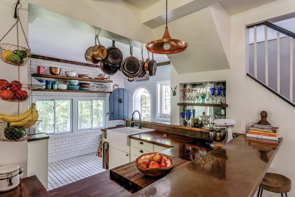 The open-concept kitchen required a complete remodel. Facci laid most of the subway tiles herself. The couple added open wood shelving, stainless steel appliances, and a farmhouse sink. In the process of the gutting the space they uncovered the arched back door, which they incorporated two the kitchen’s design. “We were very happy with the overall result,” says Facci. “I love the contrast of the wood trim against the white tile.” Credit: Winona Barton Ballentine