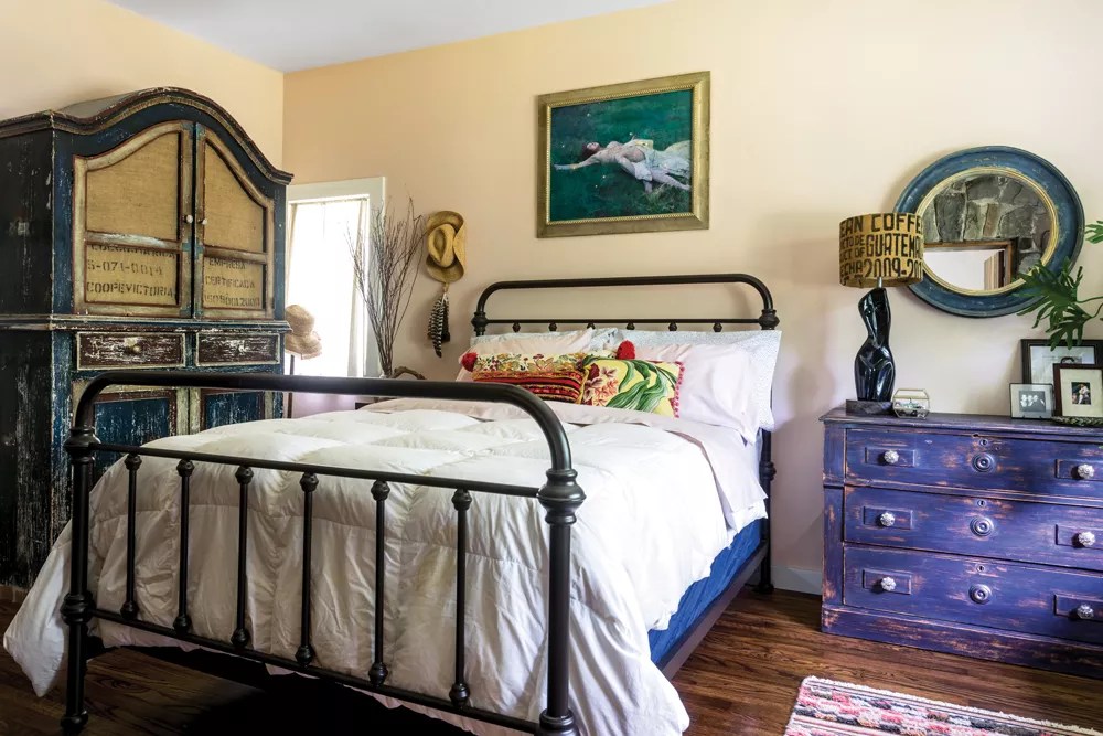 The downstairs bedroom was part of an addition added to the home sometime in the 1970s. In reworking the space, the couple could tell the difference in craft between old construction and new. “All the real problems were in the newer construction,” says Gironda. “The original construction has really stood the test of time.” To create a main bedroom suite, the couple tore out sheetrock and recovered the walls. They added a colorful mix of antique wooden drawers and an refurbished armoire with an iron-framed bed Credit: Winona Barton Ballentine