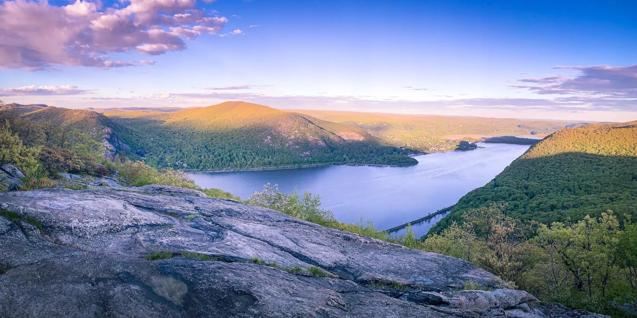 Sharply abutting the western bank of the Hudson River, Storm King Mountain offers a dramatic sunrise experience like no other. As the first rays of dawn break over Bull Hill (Mount Taurus), the valley terrain below bursts with color, creating a breathtaking panorama. While moderately challenging with a few rock scrambles, this quick route to this summit is so worth the effort. The trail from 9W takes you through dense forests and offers some of the vantage points that allow you to watch the world below awaken. There are three excellent viewing spots on Storm King’s summit. The largest and best (see photo) is an open rock ledge on the southeast side of the summit ridge, just 250 feet east of a trail junction; this also happens to be one of the finest views in the Hudson Highlands.