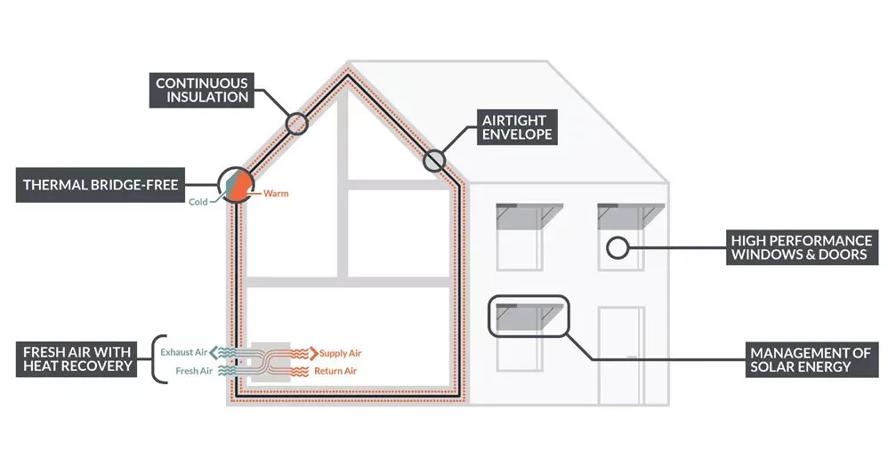 What passive house is trying to do is meet the grid in the middle, Loercher says. By building to the passive house standard, you get a significant reduction in primary energy use.
